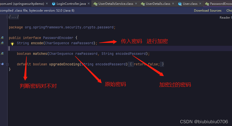 我们需要自定用户名密码这些的话,除了要实现UserDetailsService还要实现PasswordEncode