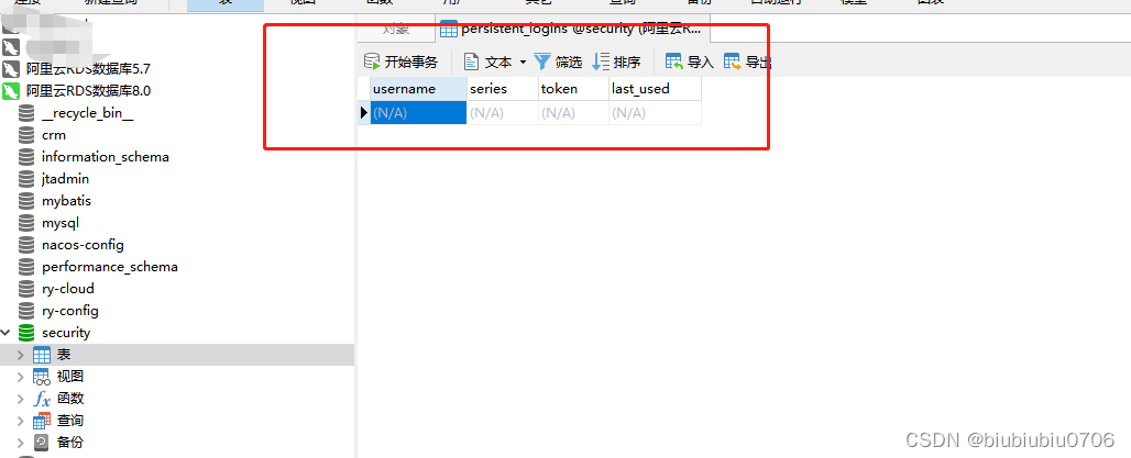spring.datasource.driver-class-name= com.mysql.cj.jdbc.Driver spring.datasource.url= jdbc:mysql://localhost:3306/security? useUnicode=true&characterEncoding=UTF-8&serverTimezone=Asia/Shanghai spring.datasource.username= root spring.datasource.password= root