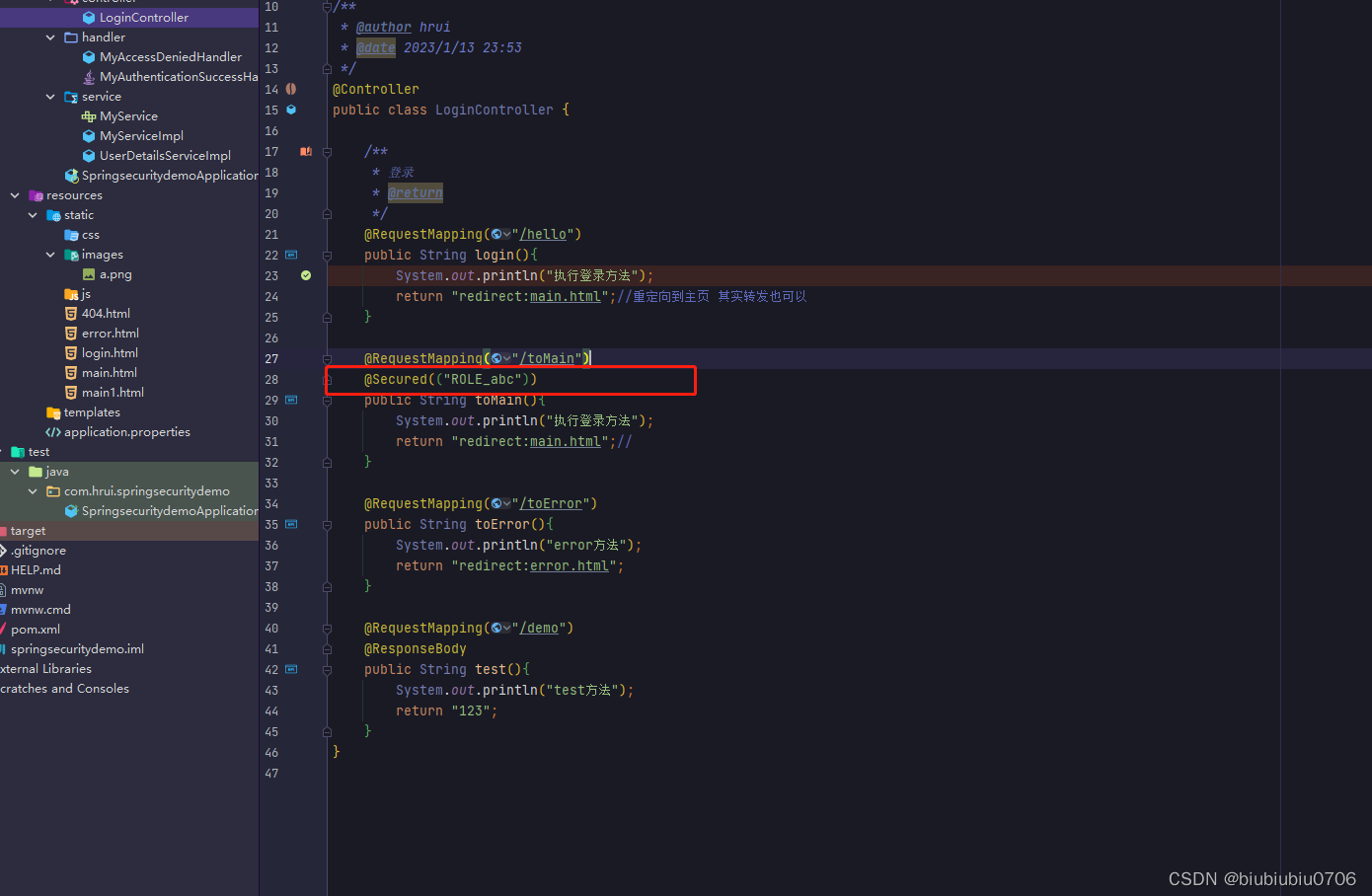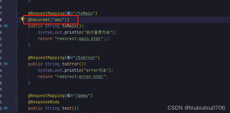 @Secured是专门用来判断是否具有角色的.能写在方法或类上.参数要以ROLE_开头