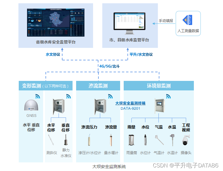 一点多发式:一路数据汇集到市县级水库安全监管平台;另一路直接汇集到省平台