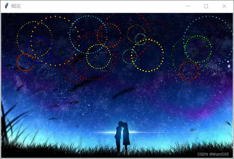 if __name__ == '__main__':width=600 #画布的宽height=375 #画布的高root=tk.Tk() #定义界面rootroot.title('烟花')screenheight=root.winfo_screenheight() #获取当前屏幕高度screenwidth=root.winfo_screenwidth() #获取当前屏幕宽度x=(screenwidth-width)//2y=(screenheight-height)//2-100root.geometry('%dx%d+%d+%d'%(width,height,x,y)) #将界面放在屏幕中央canvas=tk.Canvas(root,width=width,height=height) #将画布放在界面中铺满界面image=Image.open("d:\\图片\\烟花背景.jpg") #打开烟花背景图片image.thumbnail((width,height)) #将烟花背景缩放为画布大小photo=ImageTk.PhotoImage(image) #将烟花背景放在画布中canvas.create_image(0,0,image=photo,anchor='nw')canvas.pack() #放置画布root.protocol("WM_DELETE_WINDOW",close) #关闭循环的界面root.after(100,fireworks,canvas) #开始放烟花root.mainloop() #将界面停住
