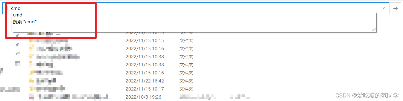 首先,进入源文件存在的目录,在文件目录处输入 cmd,然后回车。系统会自动打开 cmd 命令行窗口,并定位到当前目录。