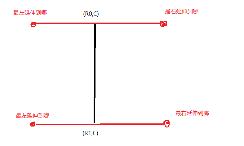 比方上图,就是去枚举第二类线段,然后判断一下线段2两端是否能直达两个目标点。思考一下,可以发现需要枚举的第二类线段,有一些特点,首先一定是直的(废话233),这样它的两个端点的横或纵坐标必有一个相同,再者两端的坐标(u0,v0),(u1,v1),对于(u0,v0),u0和v0至少有一折=者等于a/b/c/d。