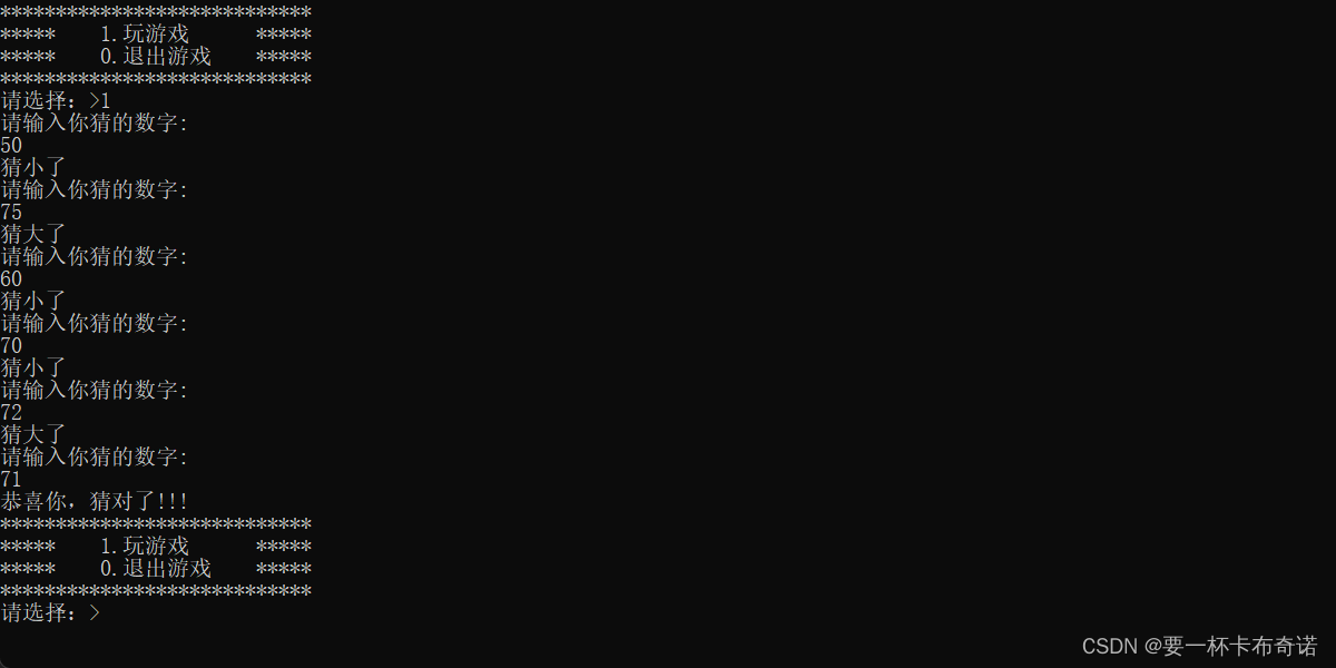 {int opt = 0;//生成随机数种子srand((unsigned int)time(NULL));do{menu();//菜单printf("请选择:>");scanf("%d", &opt);switch (opt){case 1:game();break;case 0:printf("退出游戏\n");break;default:printf("选择错误,请重新选择\n");break;}} while (opt);return 0;
