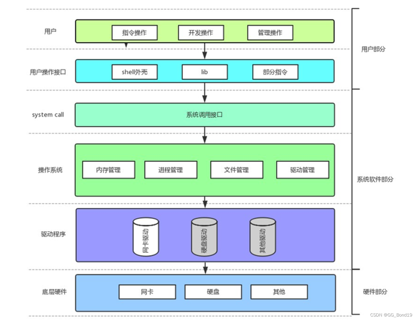 于是在操作系统与底层硬件之间增加了一层驱动层,驱动层的主要工作就是单独去控制底层硬件。例如,键盘有键盘驱动,网卡有网卡驱动,硬盘有硬盘驱动,磁盘有磁盘驱动。驱动简单来说就是去访问某个硬件,访问这个硬件的读、写以及硬件当前的状态等等,驱动层就是直接和硬件打交道的。而驱动一般是由硬件制造厂商提供的,或是由操作系统相关的模块进行开发的(例如网卡)。