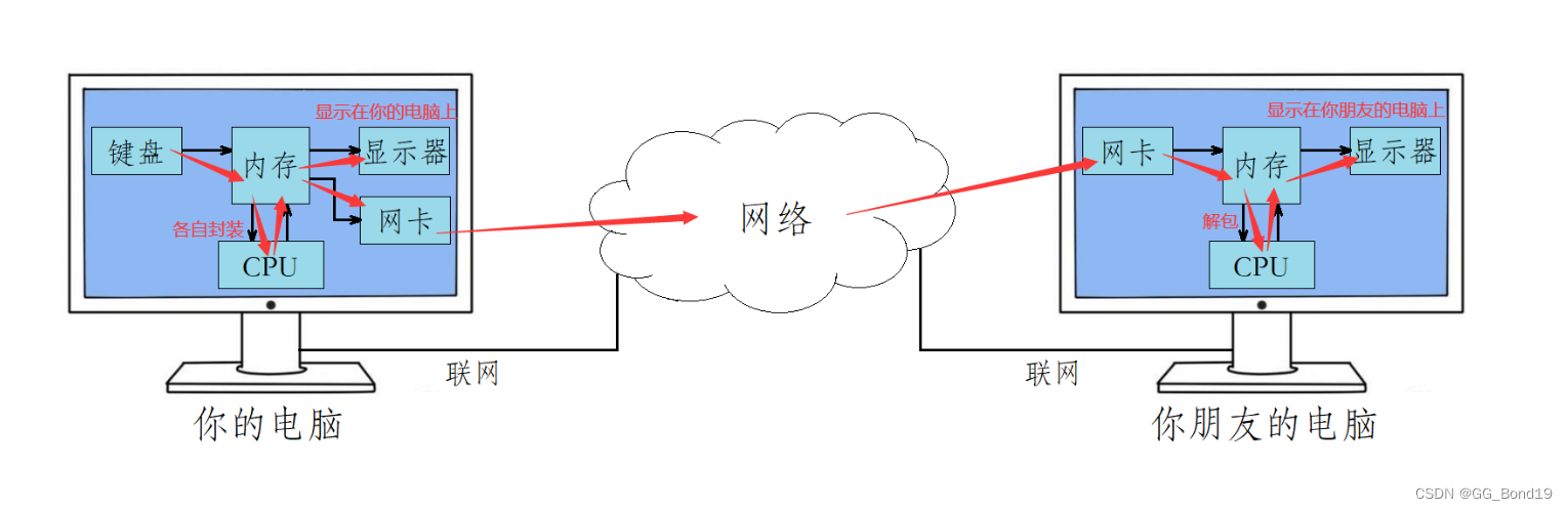 通过键盘输入信息并将消息加载到内存后,CPU从内存获取到消息后对消息进行各种处理,然后再将其写回内存,此时本地网卡就可以从内存获取已处理好的消息,然后在网络当中经过一系列处理,之后你朋友的网卡从网络当中获取到你所发的消息后,将该消息加载到内存当中,你朋友的CPU再从内存当中获取消息并对消息进行解包操作,然后将解包好的消息写回内存,最后你朋友的显示器从内存当中获取消息并显示在他的电脑上。