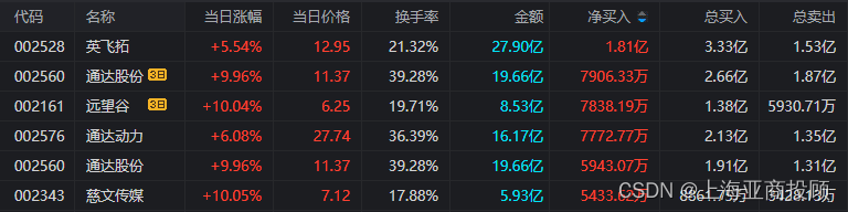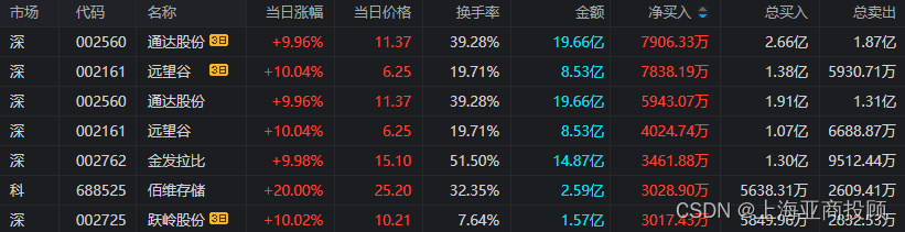 ③远望谷(002161),净额买入7838万元,所属板块:物联网。上榜原因:连续三个交易日内,涨幅偏离值累计达20%的证券。1、23年1月17日晚公告,公司拟向员工持股平台数观(宁波)文旅科技转让所持上海远望谷30%股权。本次交易完成后,上海远望谷注册资本仍为2000万元,远望谷持股70%,数观科技持股30%。2、公司是中国物联网产业的代表企业,领先的RFID技术、产品和系统解决方案供应商。3、公司基于车联网应用的超高频进行RFID标签芯片研发及产业化,车联网(汽车电子标识)业务为公司的培育业务,公司积极参与行业标准制定,布局车联网实验试点项目。4、公司是我国最早从事超高频射频识别技术(RFID)研究和开发的高科技公司之一。