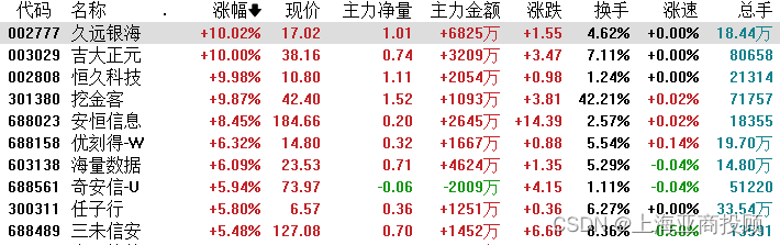 今日数据安全概念全面走强,消息面,工信部等16部门联合发布《关于促进数据安全产业发展的指导意见》,提出到2025年,我国数据安全产业规模超过1500亿元,年复合增长率超过30%。根据IDC的调研预测,随着企业数字化转型的加速,未来两年企业数据将以42.2%的高速保持增长,与此同时,企业运营中的数据只有56%能够被及时捕获,而这其中,仅有57%的数据得到了利用,43%的采集数据并没有被激活,也就是说,仅有32%的企业数据价值能够被激活。中信证券研报表示,伴随数据安全政策体系的逐步完善与落地执行,各行各业密集开启数据安全建设,数据安全成为网安行业成长的重要增量,推动网安支出占IT 支出比重提升。网安公司凭借产品线扩展能力、解决方案提供能力、行业客户资源沉淀,短期内料将最为受益,中长期亦有广阔发展空间。