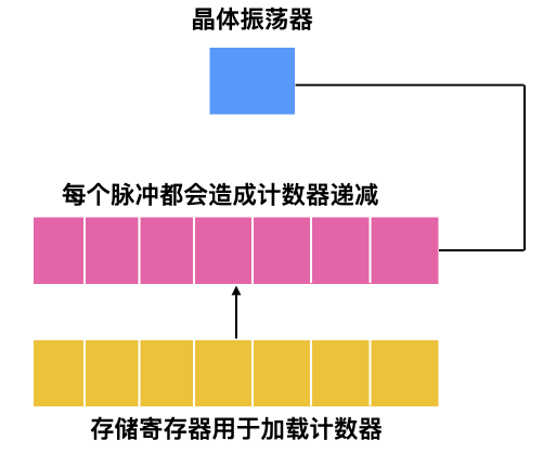 一种是 一键式(one-shot mode),当时钟启动时,会把存储器中的值复制到计数器中,然后,每次晶体的振荡器的脉冲都会使计数器 -1。当计数器变为 0 时,会产生一个中断,并停止工作,直到软件再一次显示启动。