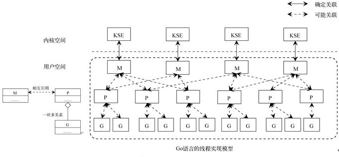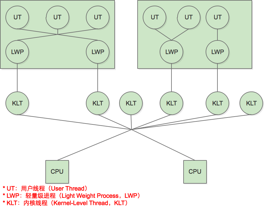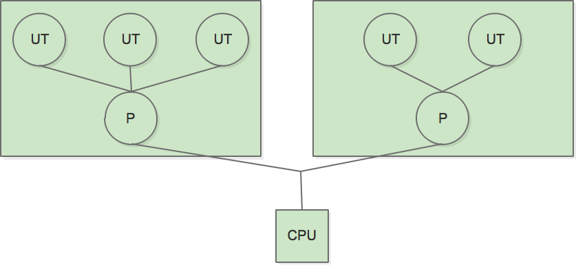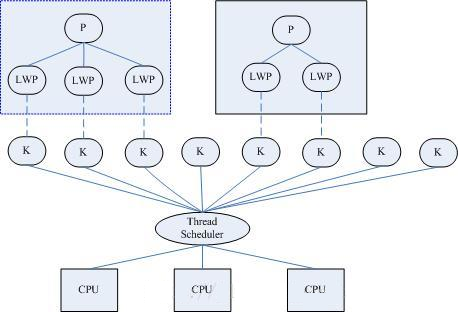 在这在模型下,程序员需要自己实现线程的数据结构、创建销毁和调度维护。也就相当于需要实现一个自己的线程调度内核,而同时这些线程运行在操作系统的一个进程内,最后操作系统直接对进程进行调度。