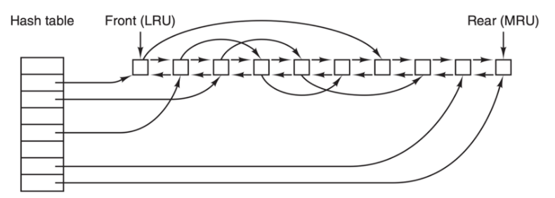 由于在高速缓存中有许多块,所以需要某种方法快速确定所需的块是否存在。常用方法是将设备和磁盘地址进行散列操作。然后在散列表中查找结果。具有相同散列值的块在一个链表中连接在一起(这个数据结构是不是很像 HashMap?),这样就可以沿着冲突链查找其他块。
