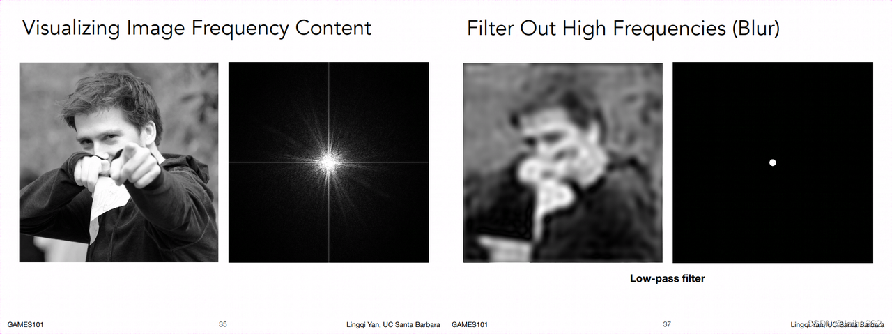 再回到前面提到过好多次的教程: Games101 中的第六章:光栅化(深度测试与抗锯齿)里面就有原图像(时域)转频域的例子: