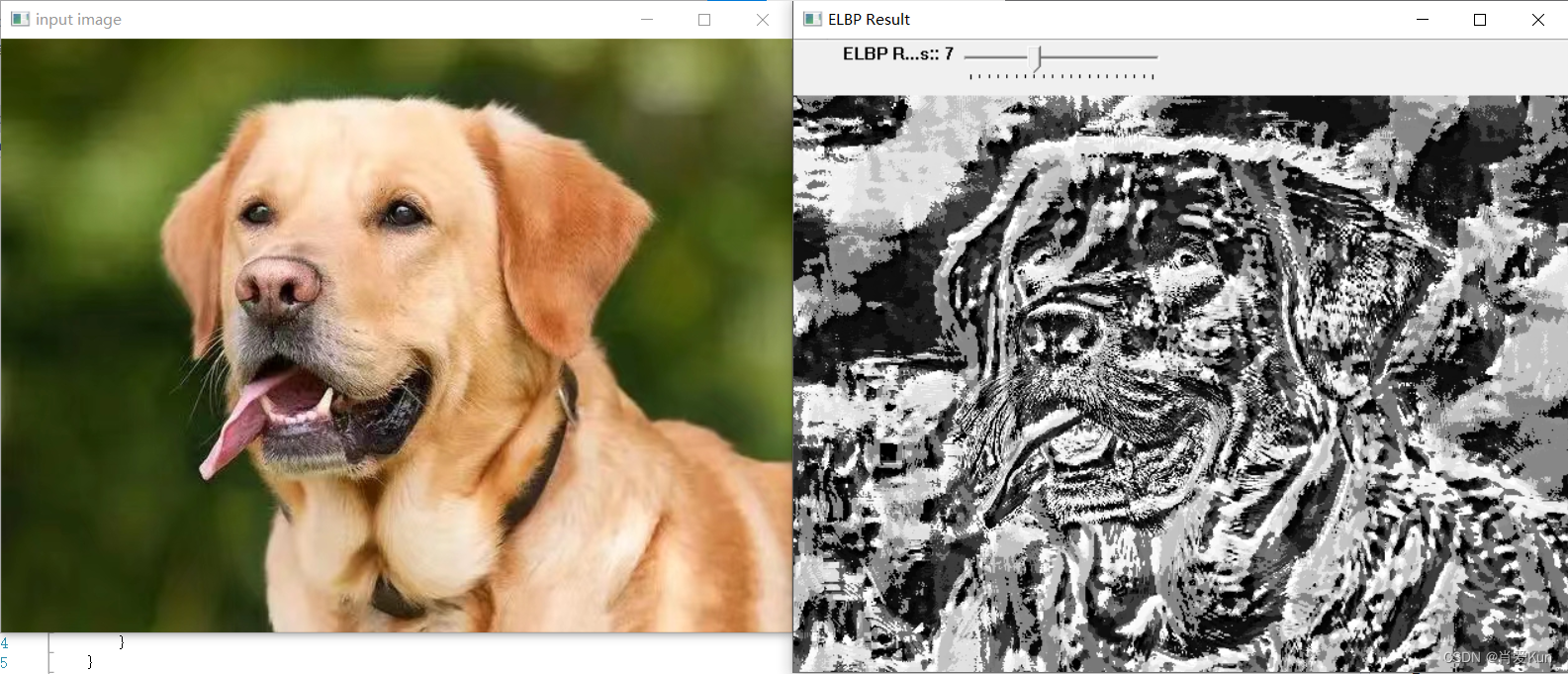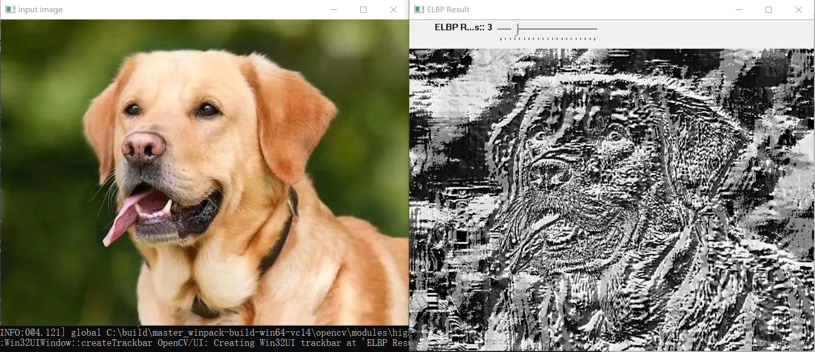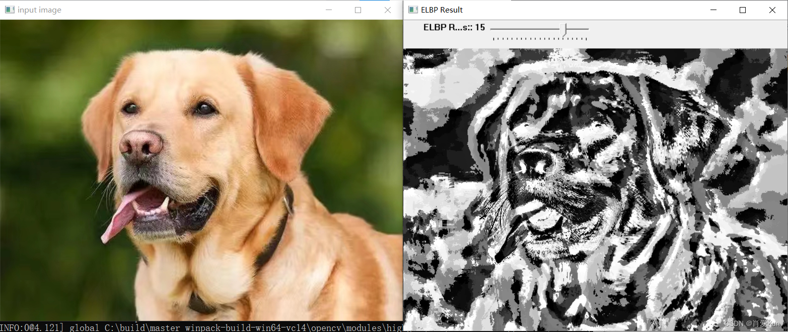 // ELBP 演示namedWindow("ELBP Result", WINDOW_AUTOSIZE);createTrackbar("ELBP Radius:", "ELBP Result", ¤t_radius, max_count, ELBP_Demo);ELBP_Demo(0, 0);waitKey(0);return 0;