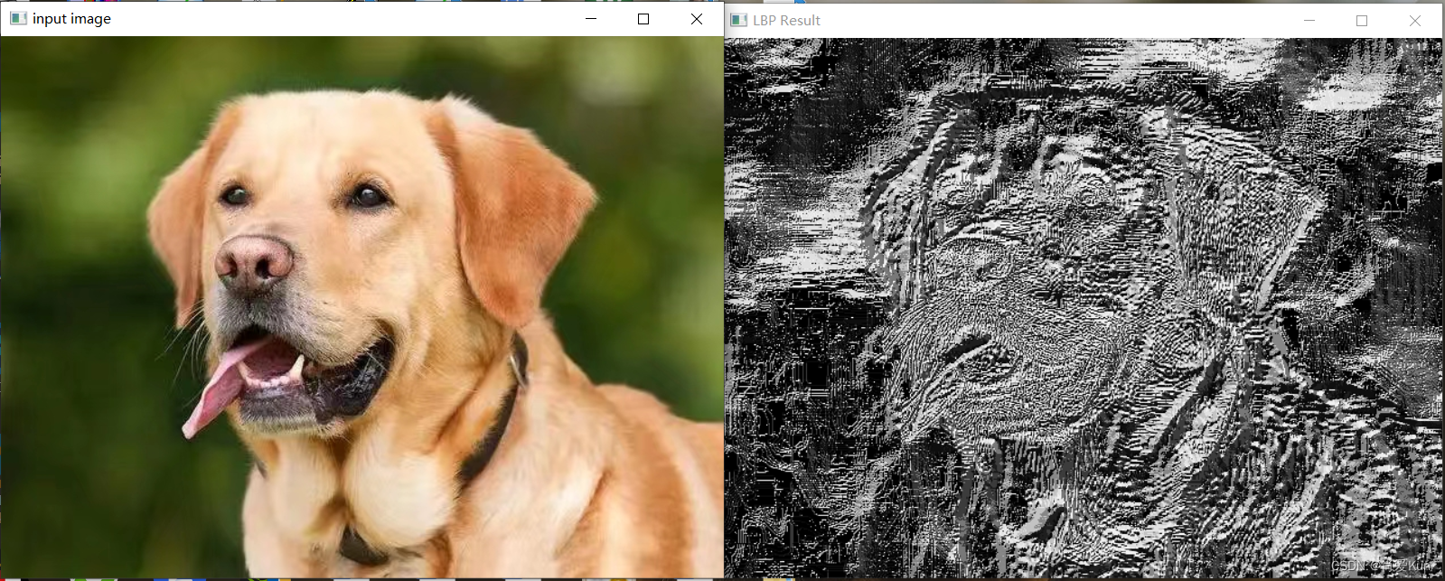 int main(int argc, char** argv) {src = imread("F:/photo/i.jpg");if (src.empty()) {printf("could not load image...\n");return -1;}const char* output_tt = "LBP Result";namedWindow("input image", WINDOW_AUTOSIZE);namedWindow(output_tt, WINDOW_AUTOSIZE);imshow("input image", src);// convert to graycvtColor(src, gray_src, COLOR_BGR2GRAY);int width = gray_src.cols;int height = gray_src.rows;// 基本LBP演示Mat lbpImage = Mat::zeros(gray_src.rows - 2, gray_src.cols - 2, CV_8UC1);for (int row = 1; row < height - 1; row++) {for (int col = 1; col < width - 1; col++) {uchar c = gray_src.at(row, col);uchar code = 0;code |= (gray_src.at(row - 1, col - 1) > c) << 7;code |= (gray_src.at(row - 1, col) > c) << 6;code |= (gray_src.at(row - 1, col + 1) > c) << 5;code |= (gray_src.at(row, col + 1) > c) << 4;code |= (gray_src.at(row + 1, col + 1) > c) << 3;code |= (gray_src.at(row + 1, col) > c) << 2;code |= (gray_src.at(row + 1, col - 1) > c) << 1;code |= (gray_src.at(row, col - 1) > c) << 0;lbpImage.at(row - 1, col - 1) = code;}}imshow(output_tt, lbpImage);