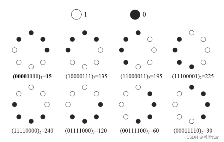 个不同的输出值,比如P=8时,值就有256个,这256个模式中每拿出一个都围绕中心点转动,那么在多次转动的过程中,会产生多种不同的结果,而这些结果中值最小的那个模式就是选择不变的二值模式了。