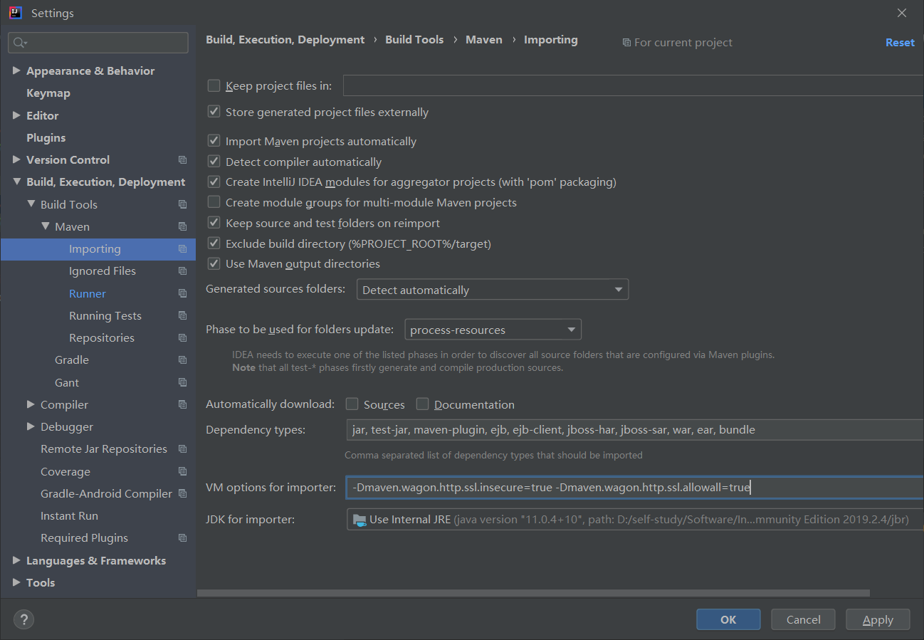 其次,在File | Settings | Build, Execution, Deployment | Build Tools | Maven | Importing中找到 VM options for importer 在其中填上