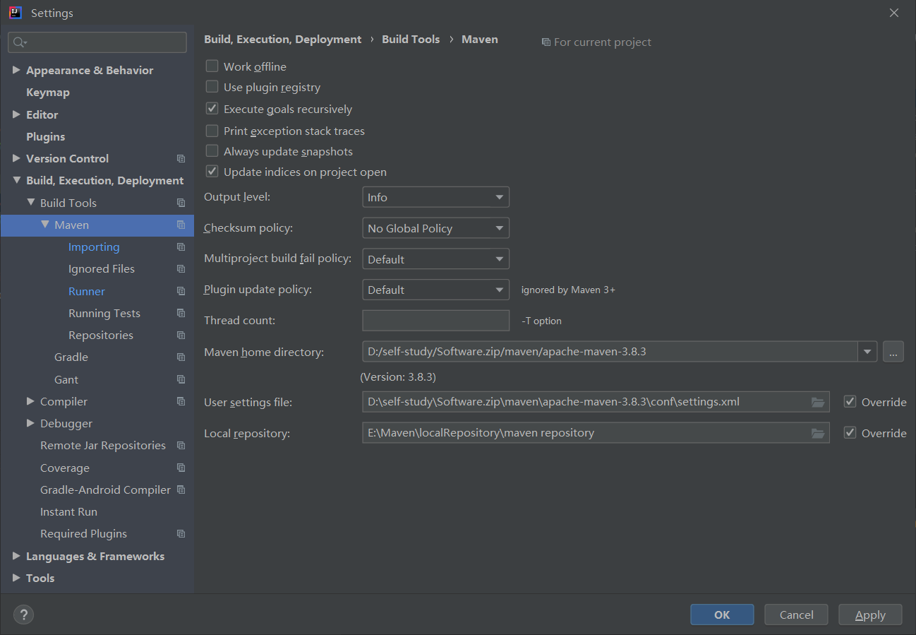然后在idea中File | Settings | Build, Execution, Deployment | Build Tools | Maven中找到Maven home path 配置成自己所下载的Maven文件,并把User settings file ,Local repository与自己的文件对应