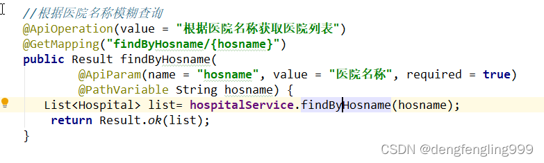 public class HospitalApiController {@Autowiredprivate HospitalService hospitalService;//查询医院列表@ApiOperation(value = "获取医院分页列表")@GetMapping("findHospList{page}/{limit}")public Result findHospList(@PathVariable Integer page,@PathVariable Integer limit,HospitalQueryVo hospitalQueryVo) {Page pageModel = hospitalService.selectHospPage(page, limit, hospitalQueryVo);return Result.ok(pageModel);}//根据医院名称模糊查询@ApiOperation(value = "根据医院名称获取医院列表")@GetMapping("findByHosname/{hosname}")public Result findByHosname(@ApiParam(name = "hosname", value = "医院名称", required = true)@PathVariable String hosname) {List list= hospitalService.findByHosname(hosname);return Result.ok(list);}}