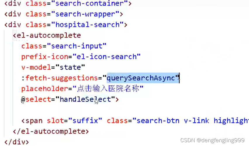 //在输入框输入值,弹出下拉框,显示相关内容querySearchAsync(queryString, cb) {this.searchObj = [];if (queryString == "") return;hospApi.getByHosname(queryString).then((response) => {for (let i = 0, len = response.data.length; i < len; i++) {response.data[i].value = response.data[i].hosname;}cb(response.data);});},//在下拉框选择某一个内容,执行下面方法,跳转到详情页面中handleSelect(item) {window.location.href = "/hosp/" + item.hoscode;},