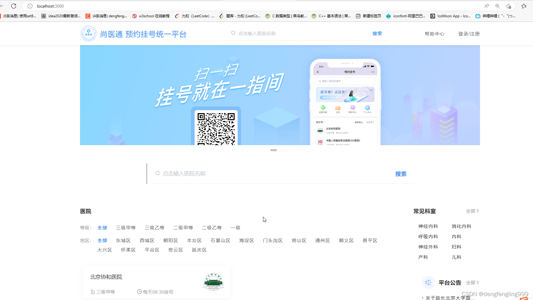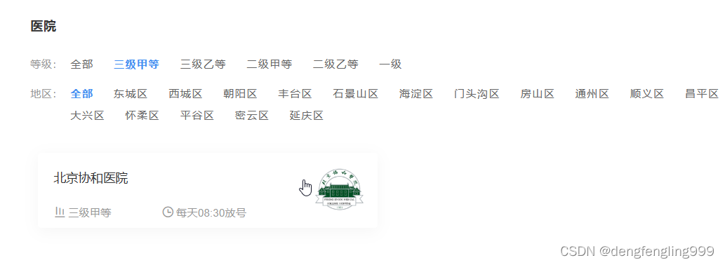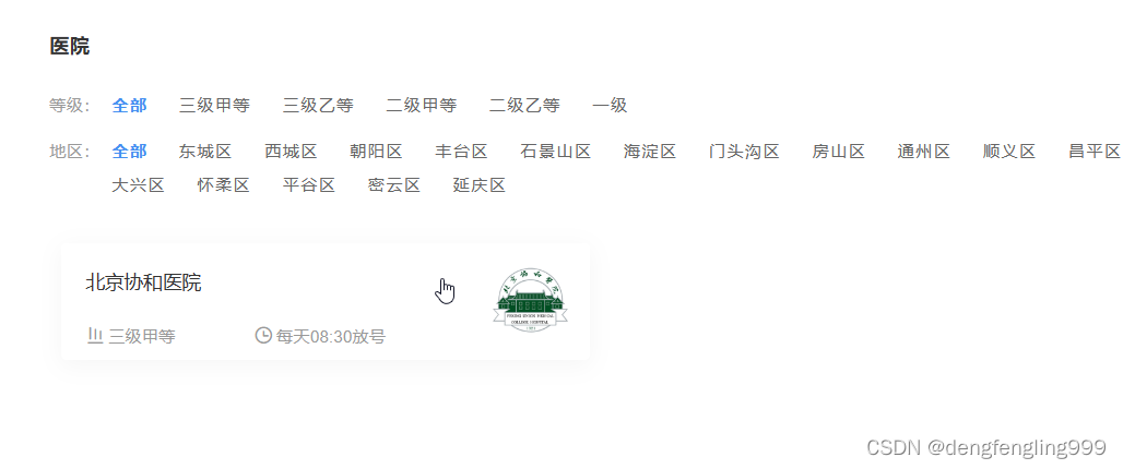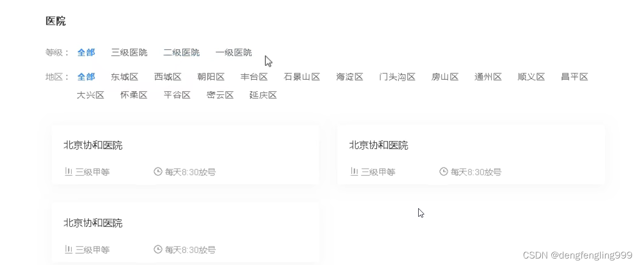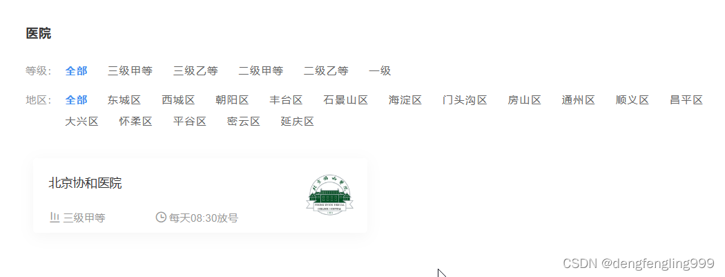 搜索 医院等级:全部 三级医院 二级医院 一级医院 地区:全部 东城区 西城区 朝阳区 丰台区 石景山区 海淀区 门头沟区 房山区 通州区 顺义区 昌平区 大兴区 怀柔区 平谷区 密云区 延庆区 北京协和医院三级甲等 每天8:30放号 北京协和医院三级甲等 每天8:30放号 启动项目:npm run dev