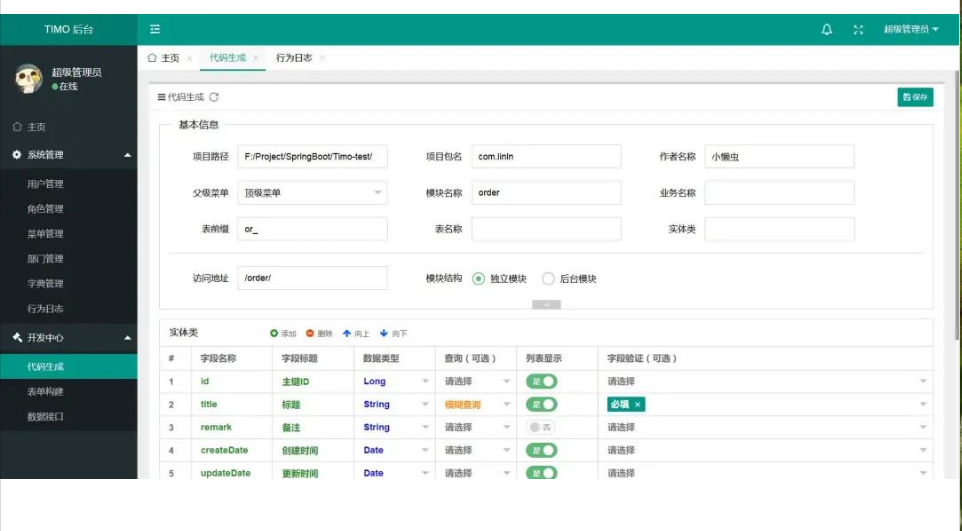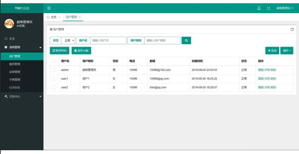 TIMO后台管理系统,基于SpringBoot2.0 + Spring Data Jpa + Thymeleaf + Shiro 开发的后台管理系统,采用分模块的方式便于开发和维护,支持前后台模块分别部署,目前支持的功能有:权限管理、部门管理、字典管理、日志记录、文件上传、代码生成等,为快速开发后台系统而生的脚手架!
