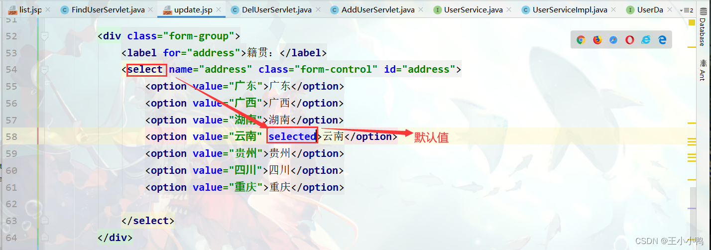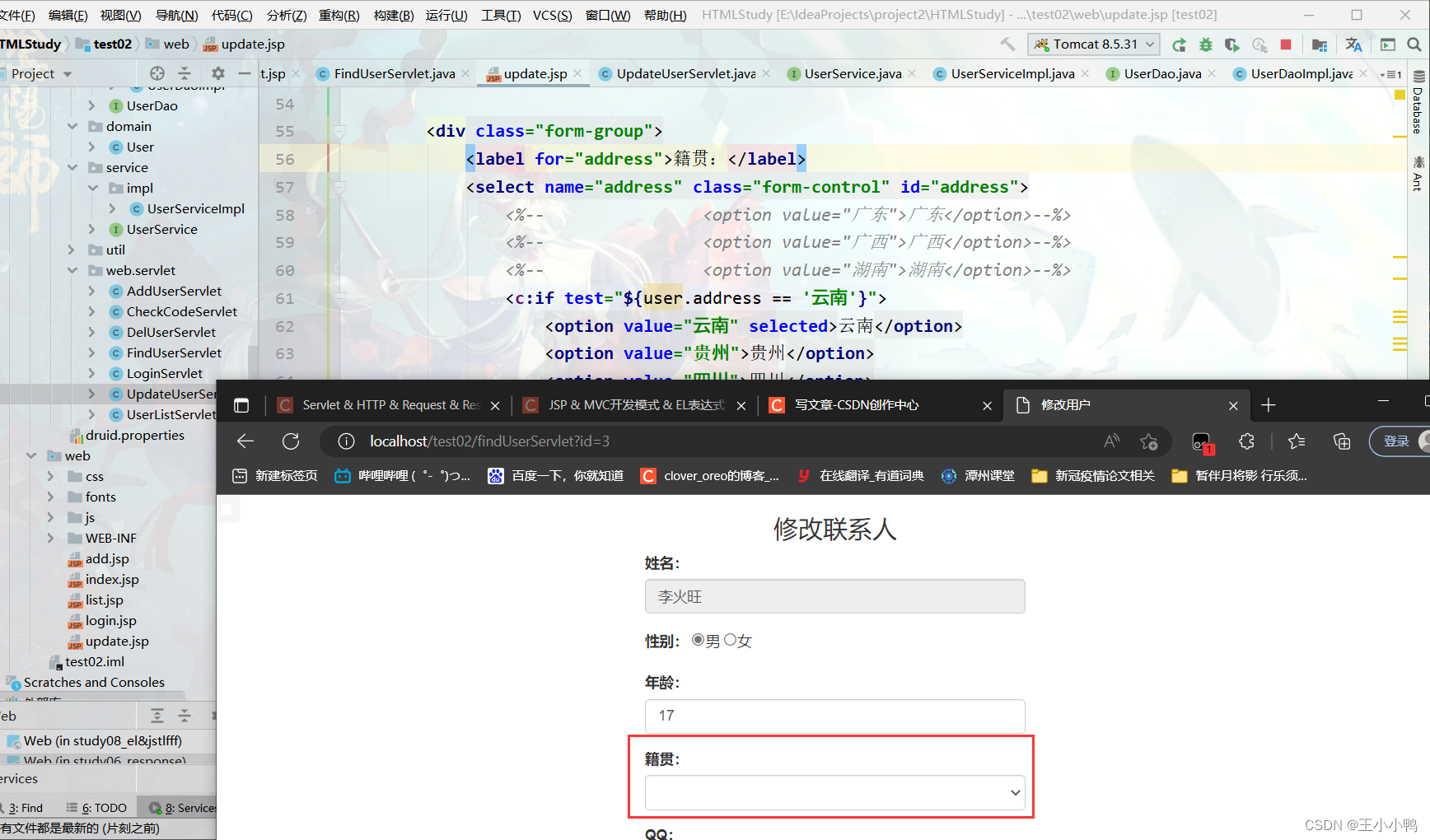 之前的修改性别和地址不知道默认值,所以要判断选择框里的性别和籍贯,需要在update.jsp开头加上标签引入