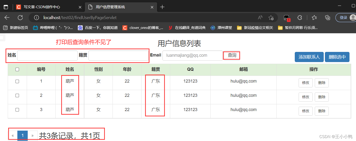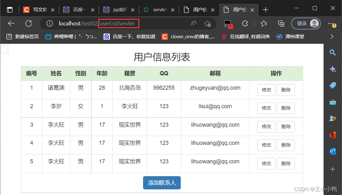 //1.设置编码request.setCharacterEncoding("utf-8");//2.获取参数Mapmap = request.getParameterMap();//3.封装对象User user = new User();try {BeanUtils.populate(user,map);} catch (IllegalAccessException e) {e.printStackTrace();} catch (InvocationTargetException e) {e.printStackTrace();}//4.调用service方法报错UserService service = new UserServiceImpl();service.addUser(user);//5.跳转到/userListServlet // 没有共享数据使用重定向 加上虚拟路径request.getContextPath()response.sendRedirect(request.getContextPath()+"/userListServlet"); UserDaoImpl中的addUser方法也优化了@Overridepublic User addUser(User user) {try {//第一版 //String sql = "insert into user2 set name = ?, gender = ?, age = ?, address = ?, qq= ?, email = ?";//第二版String sql ="insert into user2 values(null, ?, ?, ?, ?, ?, ?,null, null )";template.update(sql, user.getName(), user.getGender(), user.getAge(), user.getAddress(), user.getQq(), user.getEmail());} catch (DataAccessException e) {e.printStackTrace();}return user;}添加用户成功!