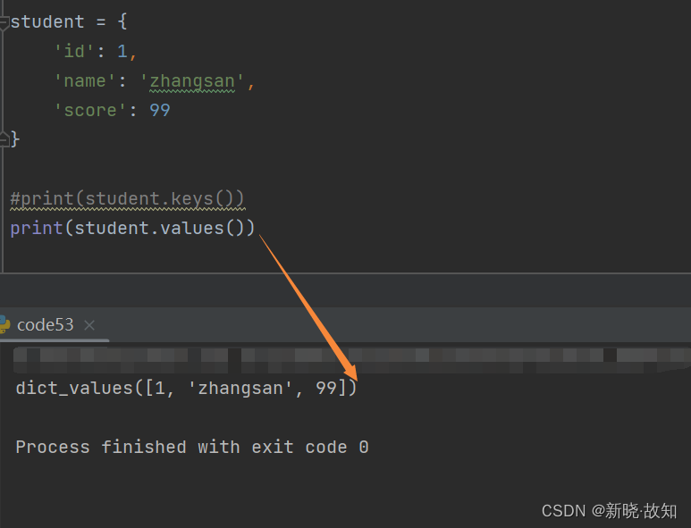 student = {'id': 1,'name': 'zhangsan','score': 80 } print(student.values())此处 dict_values 也是一个特殊的类型, 和 dict_keys 类似.