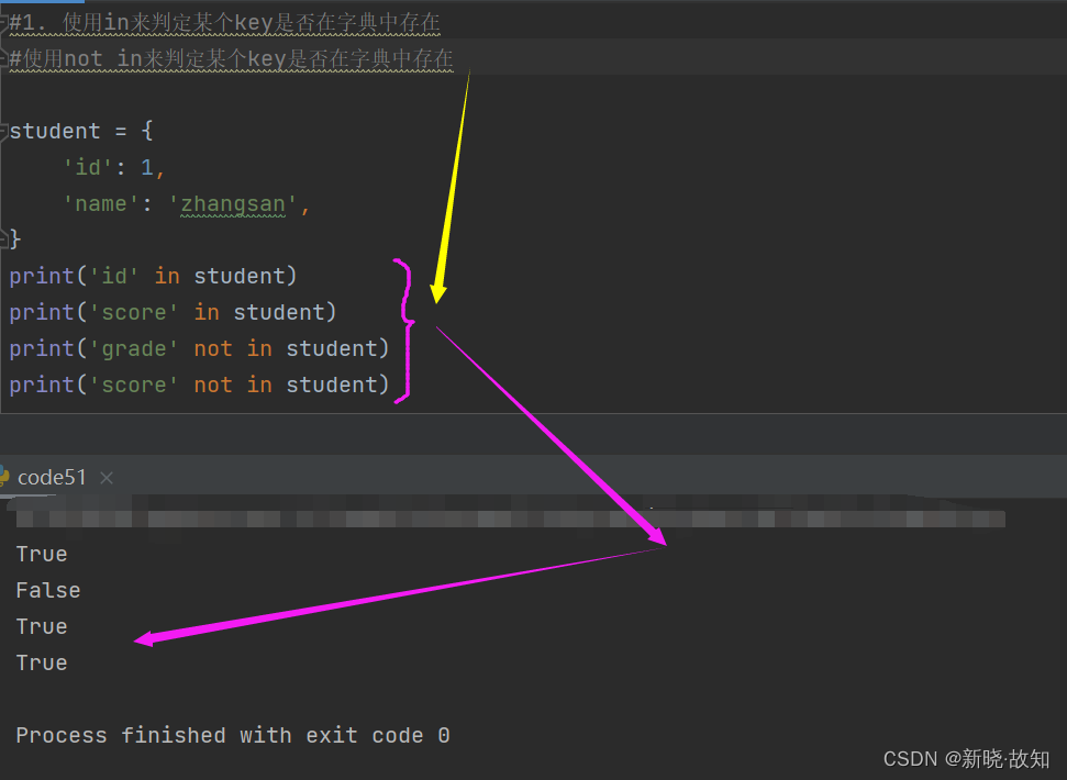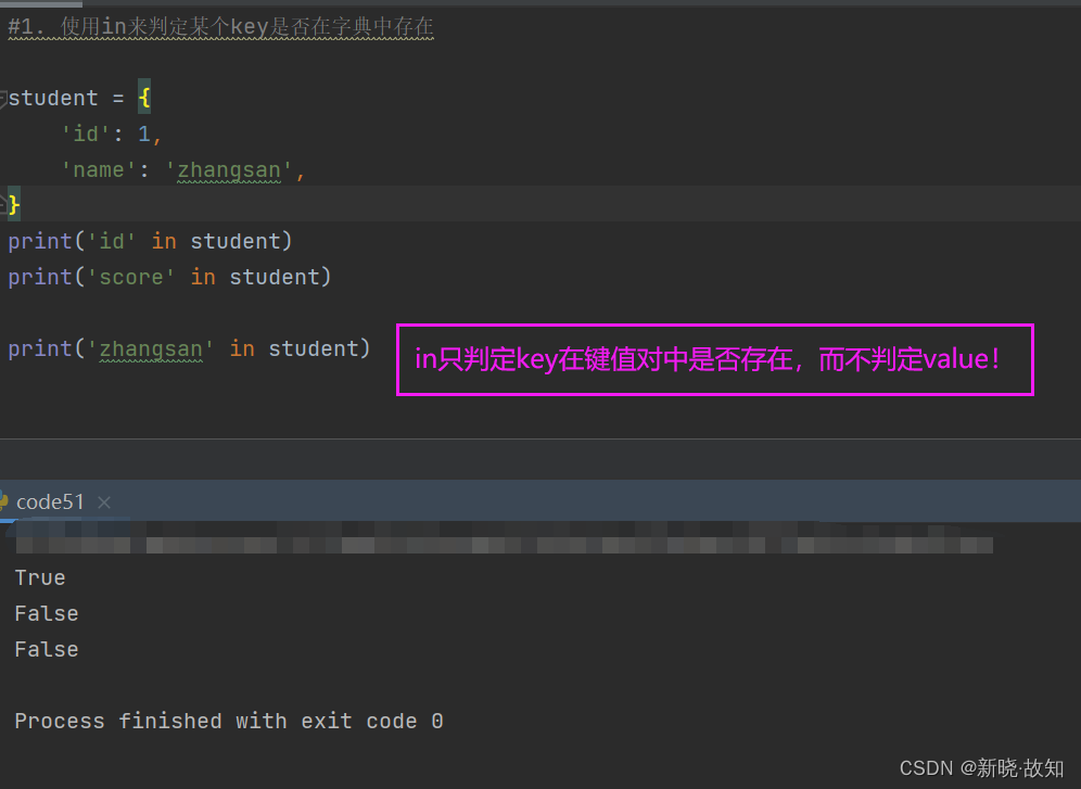student = {'id': 1,'name': 'zhangsan', } print('id' in student) print('score' in student)![]()