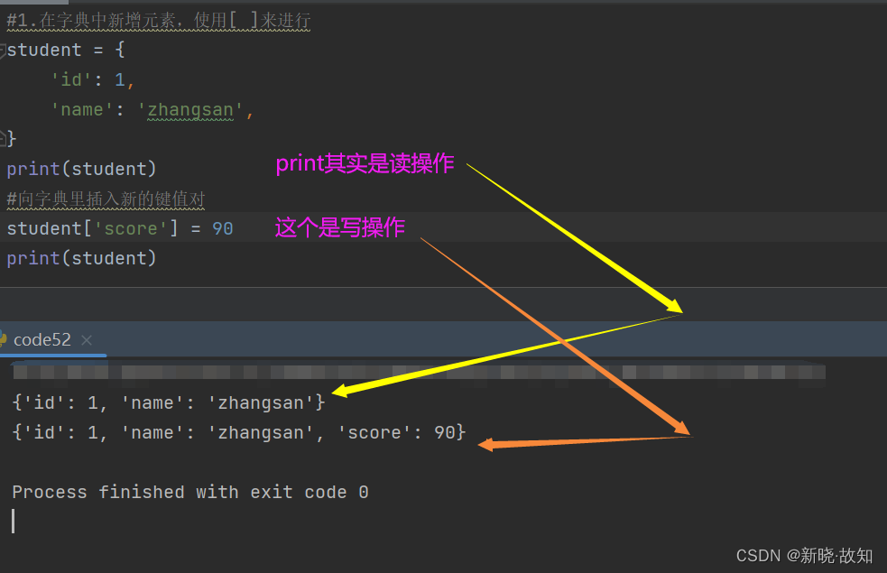 #1.在字典中新增元素,使用[ ]来进行 student = {'id': 1,'name': 'zhangsan', } print(student) #向字典里插入新的键值对 student['score'] = 90 print(student)