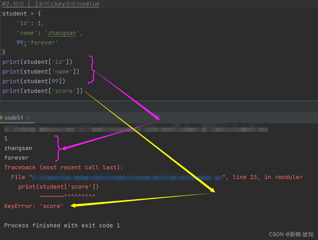 #2.使用 [ ]来判定key获取到value student = {'id': 1,'name': 'zhangsan',99:'forever' } print(student['id']) print(student['name']) print(student[99]) print(student['score'])如果 key 在字典中不存在, 则会抛出异常.