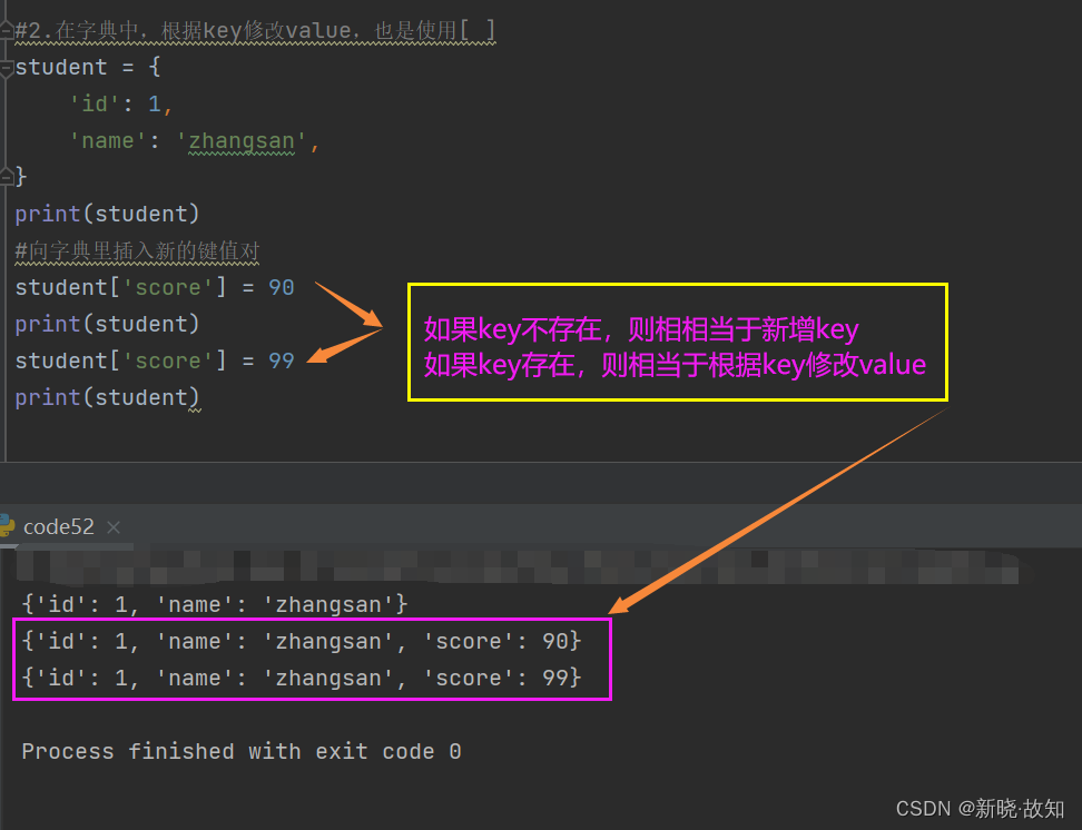 #2.在字典中,根据key修改value,也是使用[ ] student = {'id': 1,'name': 'zhangsan', } print(student) #向字典里插入新的键值对 student['score'] = 90 print(student) student['score'] = 99 print(student)1.5 删除元素