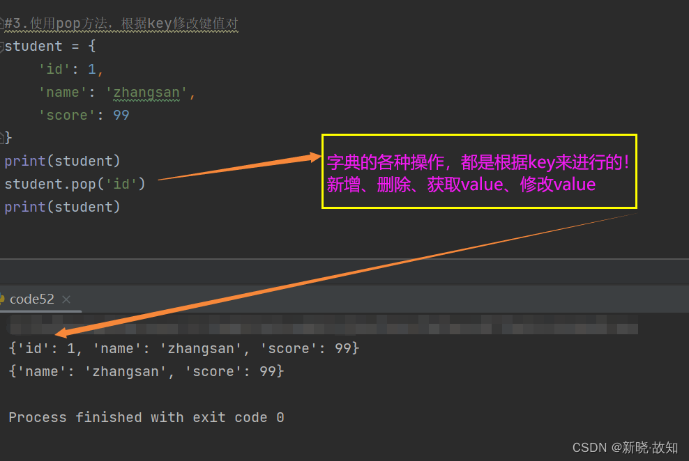 #3.使用pop方法,根据key修改键值对 student = {'id': 1,'name': 'zhangsan','score': 99 } print(student) student.pop('id') print(student)