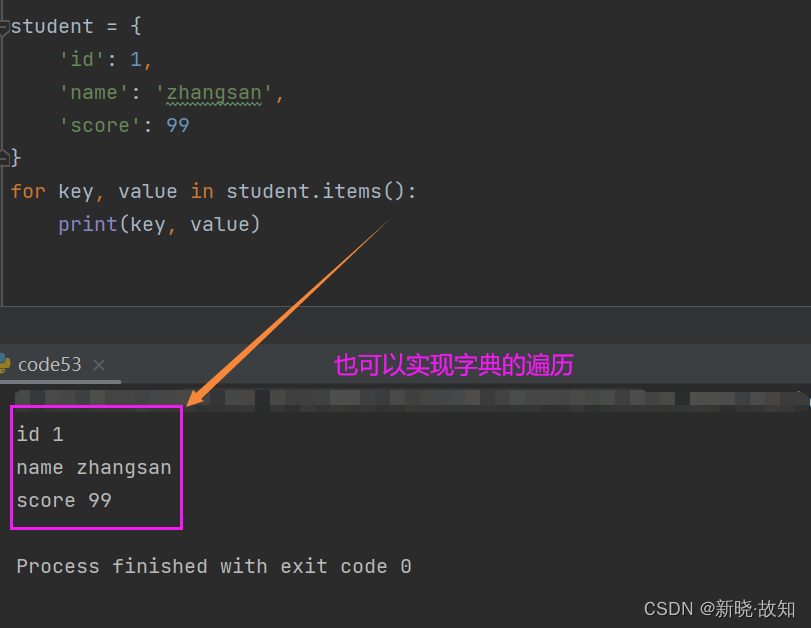 student = {'id': 1,'name': 'zhangsan','score': 99 } for key, value in student.items():print(key, value)