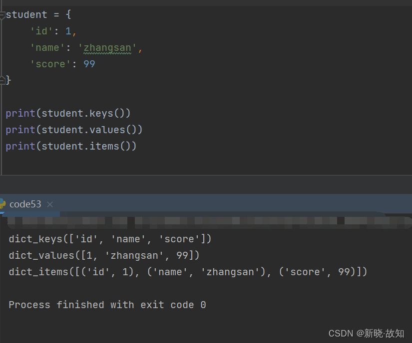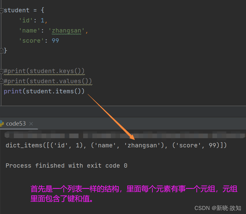 student = {'id': 1,'name': 'zhangsan','score': 80 } print(student.items())此处 dict_items 也是一个特殊的类型, 和 dict_keys 类似.