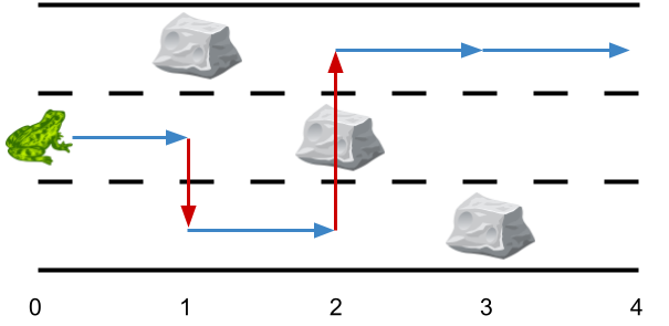 obstacles[2] == 1 ,那么说明在点 2 处跑道 1 有障碍。这只青蛙从点 i 跳到点 i + 1 且跑道不变的前提是点 i + 1 的同一跑道上没有障碍。为了躲避障碍,这只青蛙也可以在 同一个 点处 侧跳 到 另外一条 跑道(这两条跑道可以不相邻),但前提是跳过去的跑道该点处没有障碍。