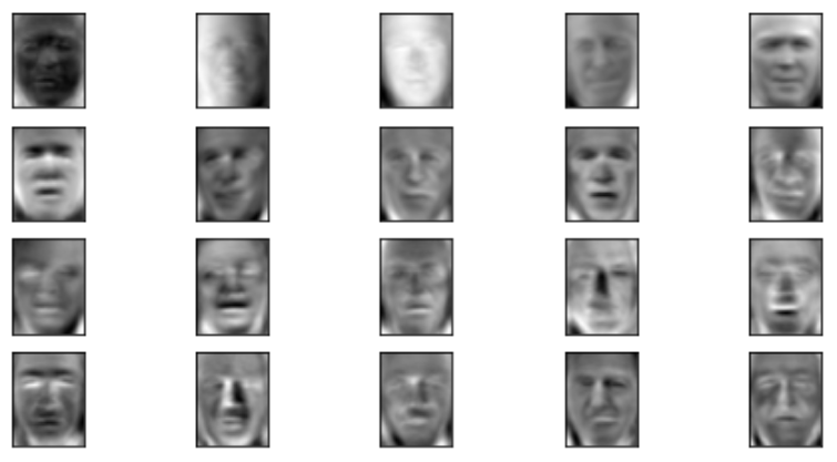 V[0].reshape(62,47).shape #(62, 47)fig, axes = plt.subplots(4,5,figsize=(8,4),subplot_kw = {"xticks":[],"yticks":[]})for i, ax in enumerate(axes.flat):ax.imshow(V[i,:].reshape(62,47),cmap="gray")