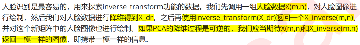 inverse_transform的功能,是基于X_dr中的数据进行升维,将数据重新映射到原数据所在的特征空间中,而非恢复所有原有数据。但同时,降维后的数据确实保留了原数据的大部分信息,所以图像看起来才会和原数据高度相似,只是稍稍模糊 —— 提取和储存的信息可以很少,但还是可以有很高的匹配精度(火车站等地方人脸识别机器识别速度很快的原因)