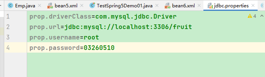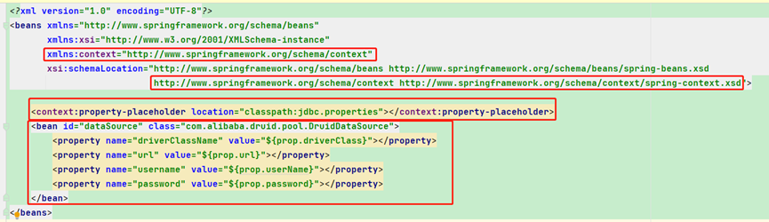 第三步:把外部properties属性文件引入到spring配置文件中,引入contest名称空间