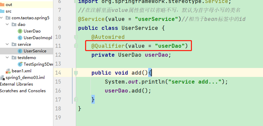 @Qualifier:根据属性名称进行注入,需要和@Autowired一起使用