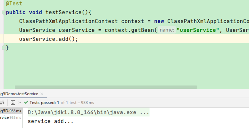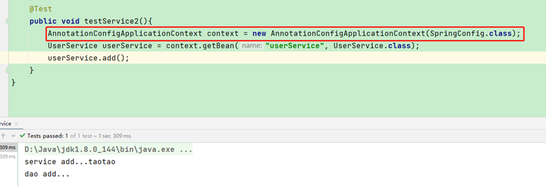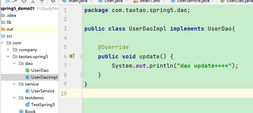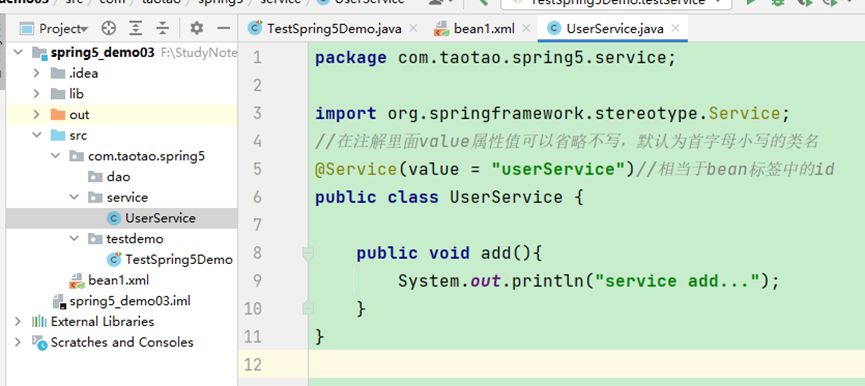 创建两个类service和dao,在service中调用dao,在spring配置文件中进行配置