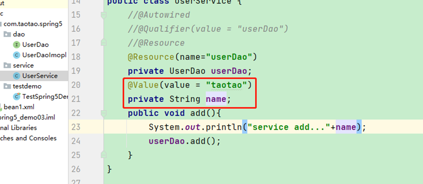 @Autowired:根据属性类型进行自动装配,例如在service类里注入dao对象,首先在两个类上都添加注解,其次在service类的dao属性上添加@Autowired注解(不需要添加set方法)