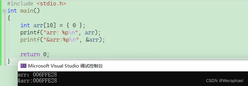 {int arr[10] = { 0 };printf("arr:%p\n", arr);printf("&arr:%p\n", &arr);return 0;