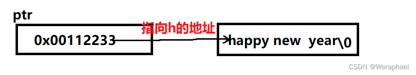 这串代码很容易认为是把字符串"happy new year"放到字符指针ptr里了,但本质是把字符串“happy new year”的首字母h的地址放到了ptr中。
