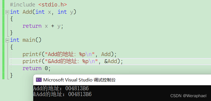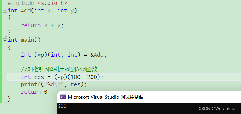 {int (*p)(int, int) = &Add;//对指针p解引用找到Add函数int res = (*p)(100, 200);printf("%d\n", res);return 0;