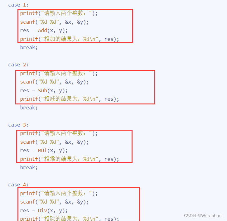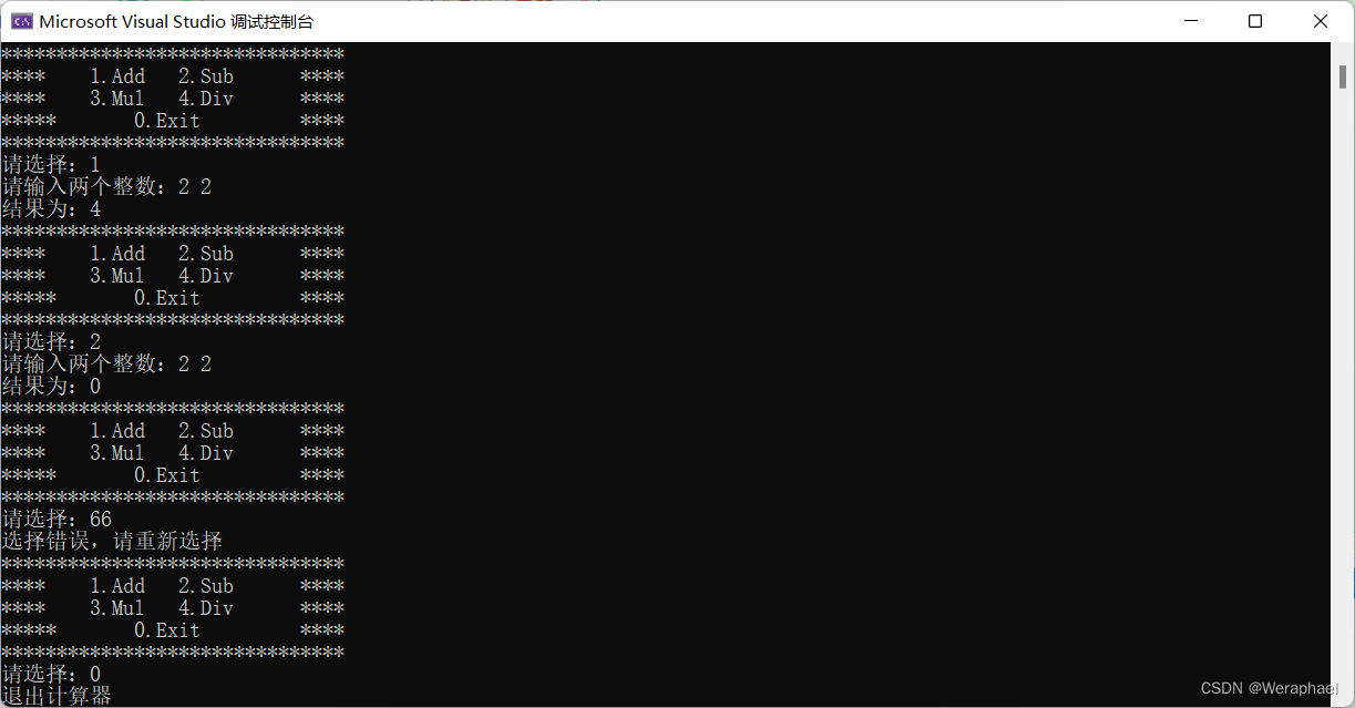 {int input = 0;int x = 0;int y = 0;int res = 0;do{menu(); //打印菜单printf("请选择:");scanf("%d", &input);switch (input){case 1:printf("请输入两个整数:");scanf("%d %d", &x, &y);res = Add(x, y);printf("相加的结果为:%d\n", res);break;case 2:printf("请输入两个整数:");scanf("%d %d", &x, &y);res = Sub(x, y);printf("相减的结果为:%d\n", res);break;case 3:printf("请输入两个整数:");scanf("%d %d", &x, &y);res = Mul(x, y);printf("相乘的结果为:%d\n", res);break;case 4:printf("请输入两个整数:");scanf("%d %d", &x, &y);res = Div(x, y);printf("相除的结果为:%d\n", res);break;case 0:printf("退出计算器");break;default:printf("选择错误\n");break;}} while (input);
