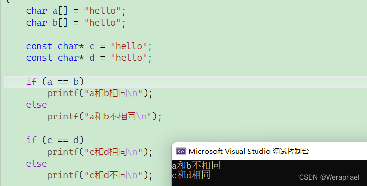{char a[] = "hello";char b[] = "hello";const char* c = "hello";const char* d = "hello";if (a == b)printf("a和b相同\n");elseprintf("a和b不相同\n");if (c == d)printf("c和d相同\n");elseprintf("c和d不同\n");return 0;