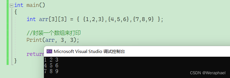{int arr[3][3] = { {1,2,3},{4,5,6},{7,8,9} };//封装一个数组来打印Print(arr, 3, 3);return 0;