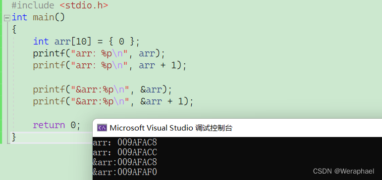 {int arr[10] = { 0 };printf("arr:%p\n", arr);printf("arr:%p\n", arr + 1);printf("&arr:%p\n", &arr);printf("&arr:%p\n", &arr + 1);return 0;