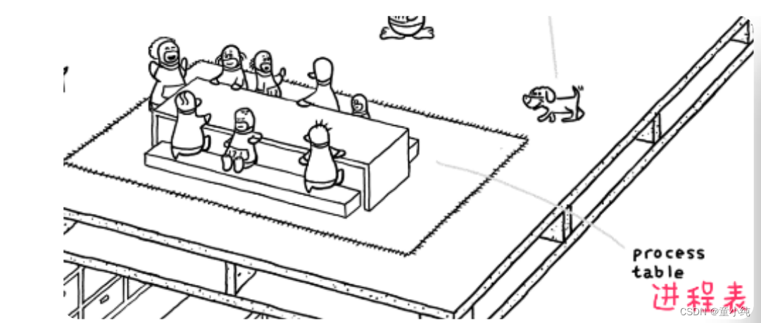 地基(底层)由一排排的文件柜组成,然有序,文件柜里放置 着“文件”—电脑中的文件。左上角,有一只胸前挂着421号牌的 小企鹅,它表示着PID (进程ID(Process ID) )为421的进程、它正在查看文件柜中的文件,这代表系统中正有一个进程在访问 文件系统。在右下角有一只小狗,它是看门狗(watchdog) 、这代表对文件系统的监控。
